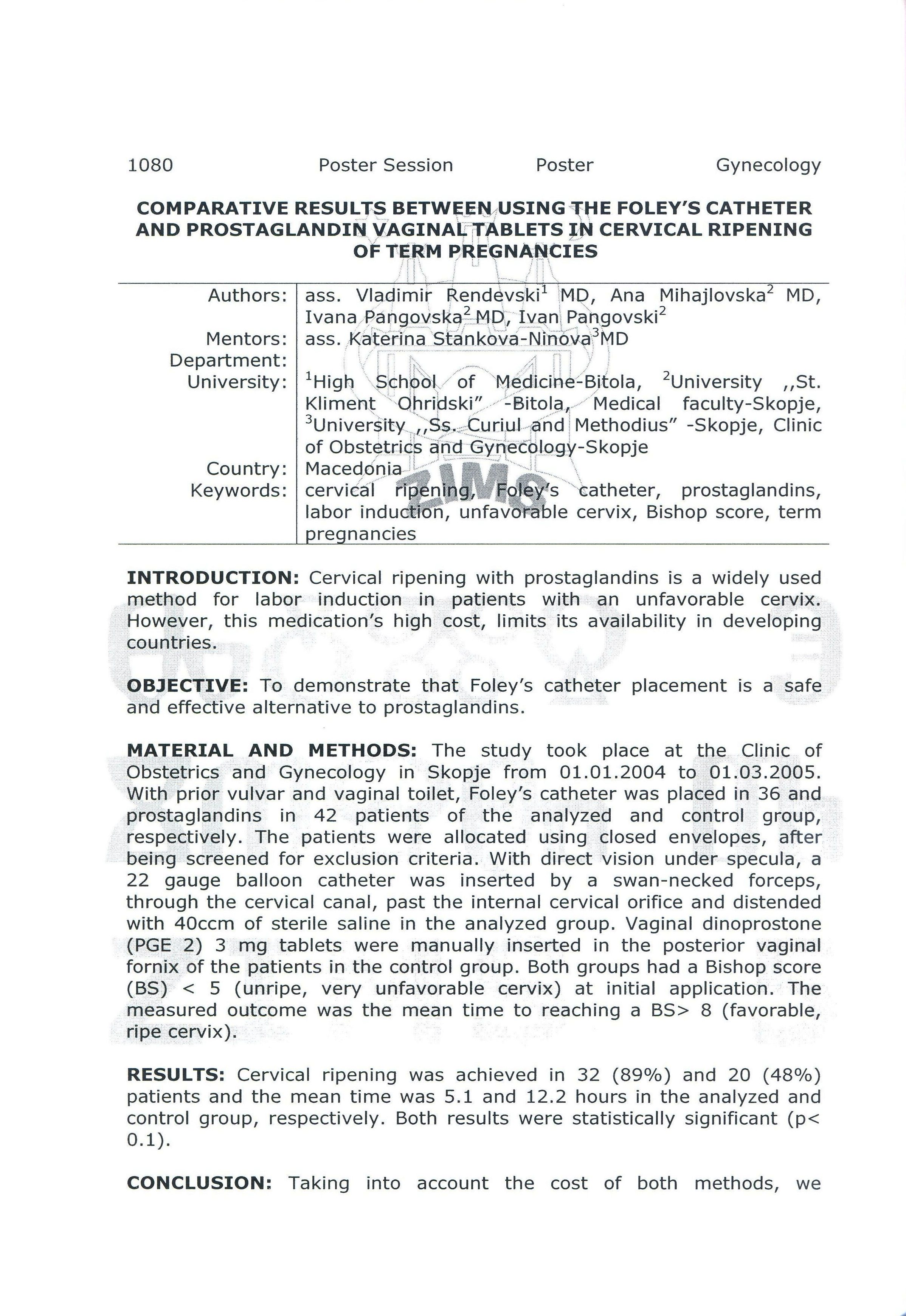 Comparative results between using the Foley’s catheter and prostaglandin vaginal tablets in cervical ripening of term pregnancies.
