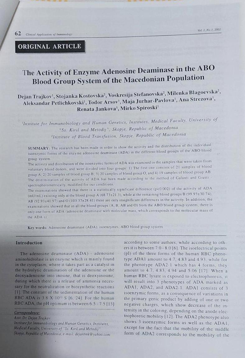 The activity of enzyme adenosine deaminase in the ABO blood group system of the Macedonian population
