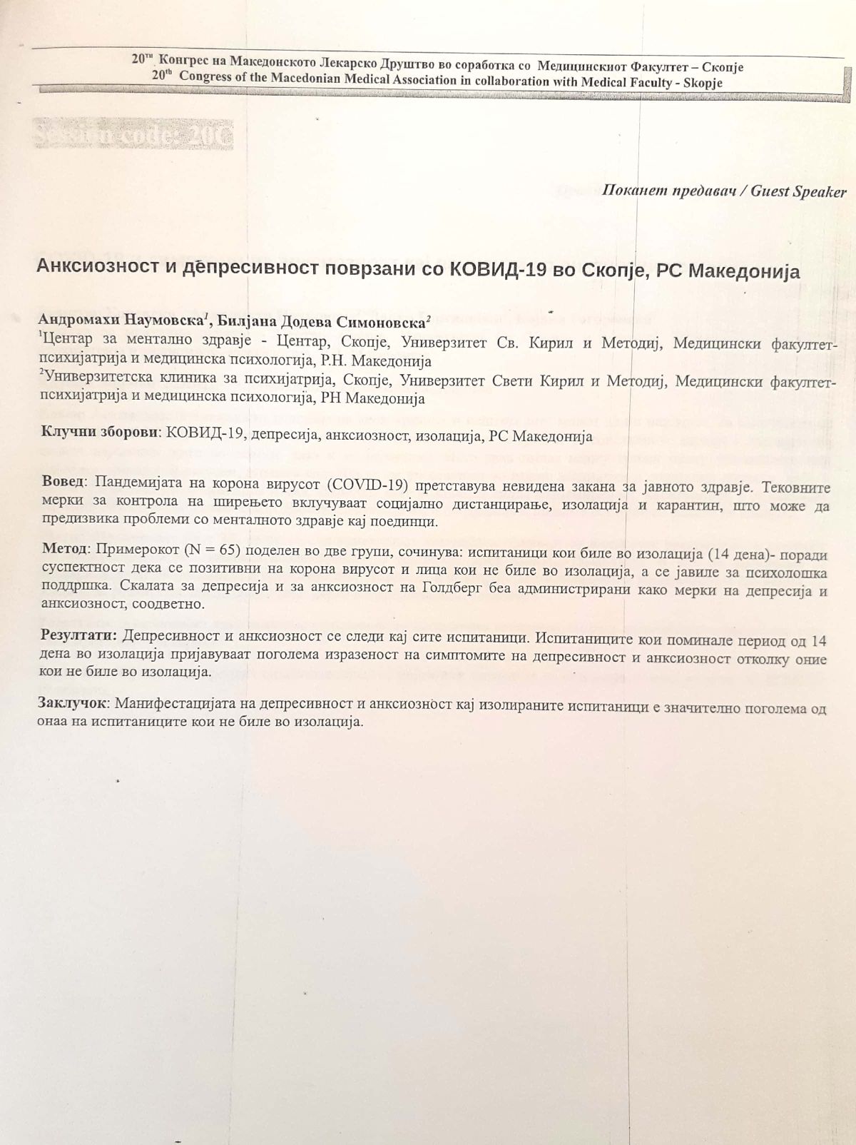 Анксиозност и депресивност поврзани со Ковид 19 во Скопје, РС Македонија