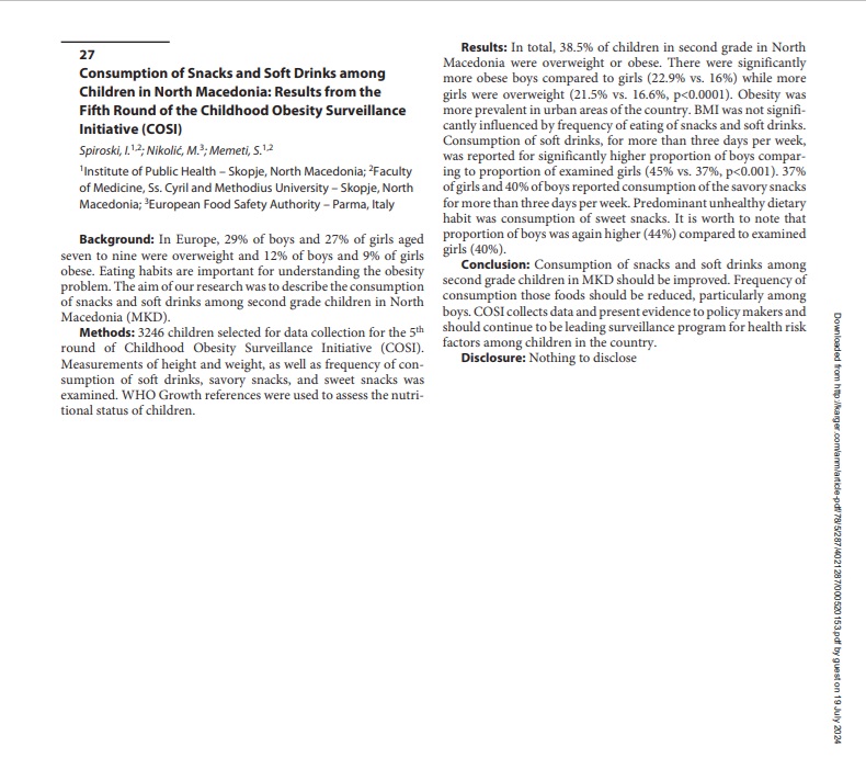 Consumption of snacks and soft drinks among children in North Macedonia: Results from the fifth round of the Childhood Obesity Surveillance Initiative (COSI).
