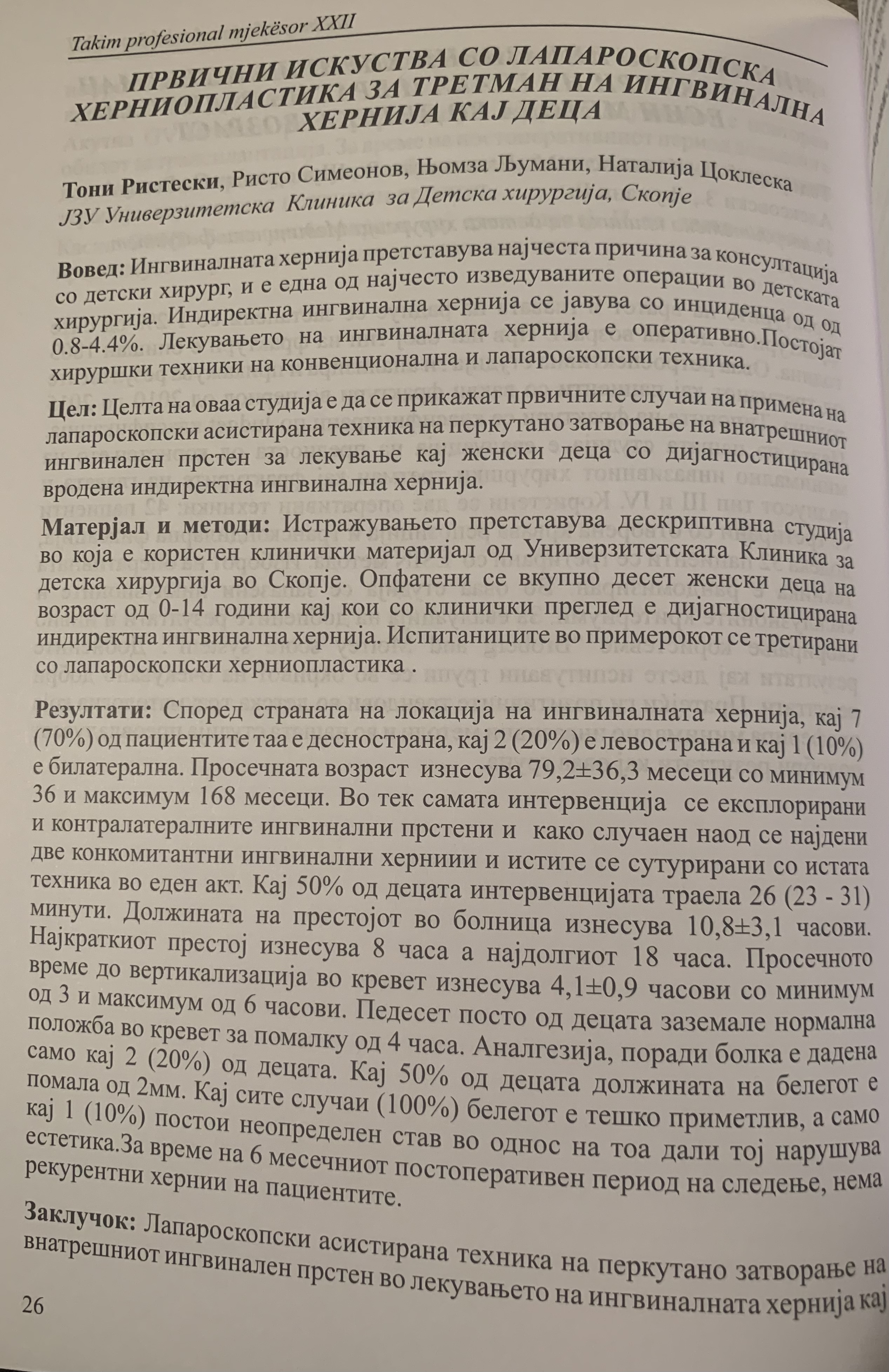 Заклучок: Лапароскопски асистирана техника на перкутано затворање на внатрешниот ингвинален прстен во лекувањето на ингвиналната хернија кај женските деца е минимално инвазивна техника. Иако ни е потребно повеќе искуство лапароскопската техника дава повеќе предности како безбедна и ефективна техника, со намалена постоперативната болка, намален престој во болница, побрзо враќање на нормалните активности, како и одличен козметички ефект.