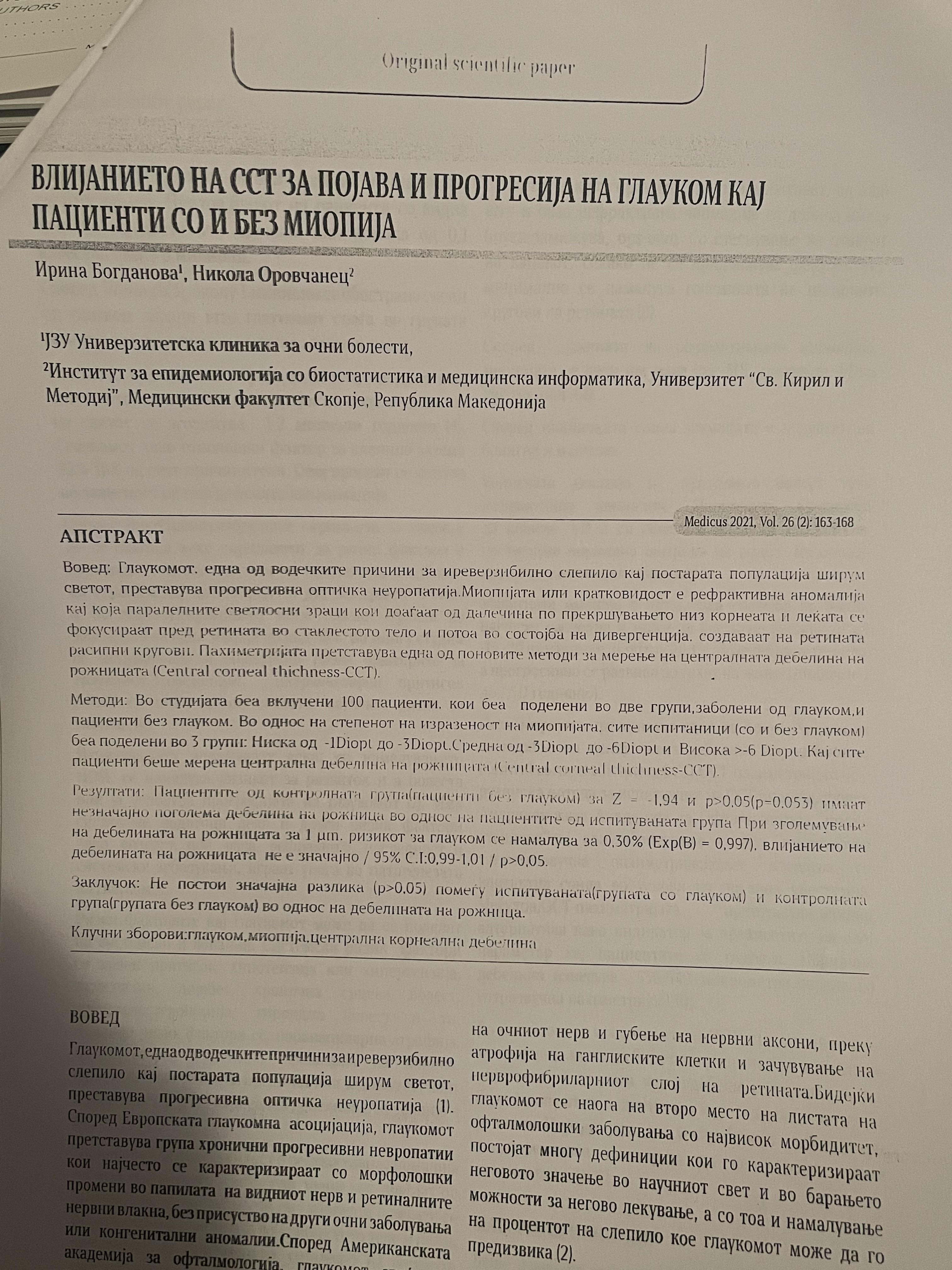 Влијанието на CCT за појава и прогресија на глауком кај пациенти со и без миопија