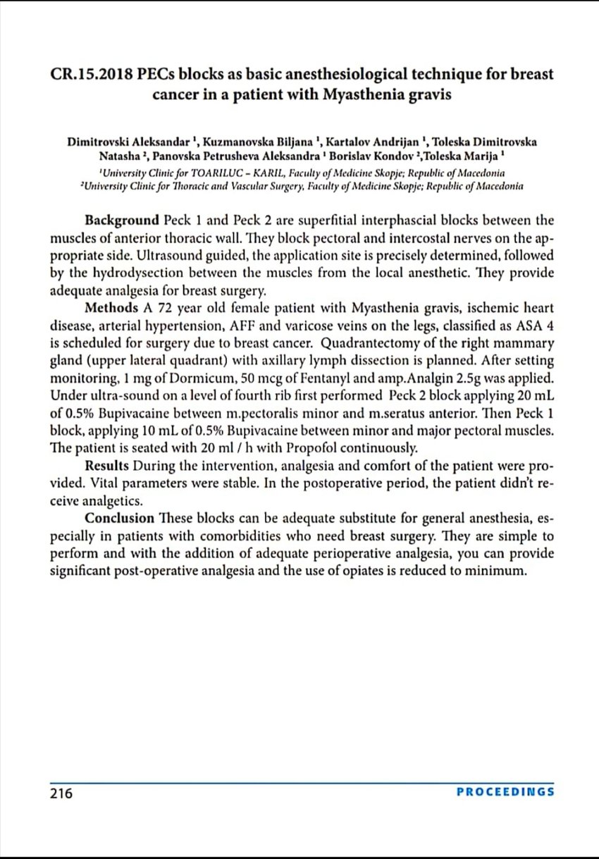 Background : Peck 1 and Peck 2 are superfitial interphascial blocks between the muscles of anterior thoracic wall. They block pectoral and intercostal nerves on the ap- propriate side. Ultrasound guided, the application site is precisely determined, followed by the hydrodysection between the muscles from the local anesthetic. They provide adequate analgesia for breast surgery. Methods : A 72 year old female patient with Myasthenia gravis, ischemic heart disease, arterial hypertension, AFF and varicose veins on the legs, classified as ASA 4 is scheduled for surgery due to breast cancer. Quadrantectomy of the right mammary gland (upper lateral quadrant) with axillary lymph dissection is planned. After setting monitoring, 1 mg of Dormicum, 50 mcg of Fentanyl and amp.Analgin 2.5g was applied. Under ultra-sound on a level of fourth rib first performed Peck 2 block applying 20 mL of 0.5% Bupivacaine between m.pectoralis minor and m.seratus anterior. Then Peck 1 block, applying 10 mL of 0.5% Bupivacaine between minor and major pectoral muscles. The patient is seated with 20 ml / h with Propofol continuously. Results During the intervention, analgesia and comfort of the patient were provided. Vital parameters were stable. In the postoperative period, the patient didn’t re- ceive analgetics. Conclusion: These blocks can be adequate substitute for general anesthesia, es- pecially in patients with comorbidities who need breast surgery. They are simple to perform and with the addition of adequate perioperative analgesia, you can provide significant post-operative analgesia and the use of opiates is reduced to minimum.