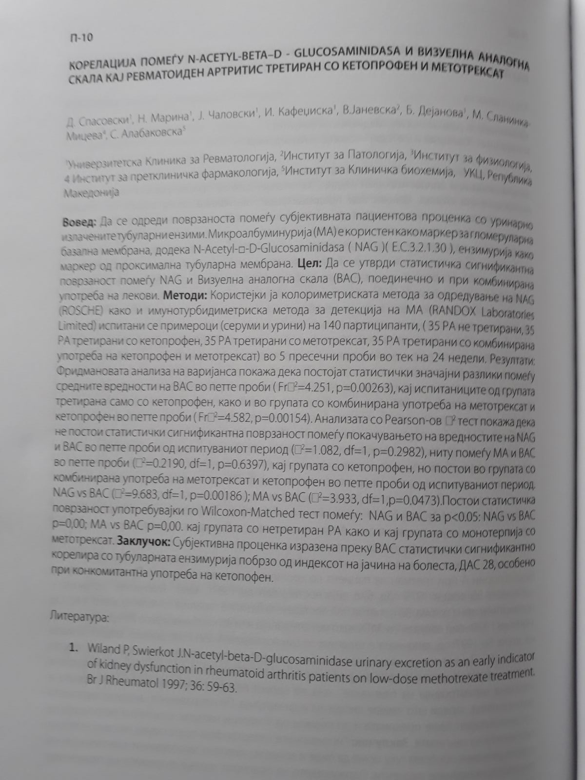 Корелација помеѓу N-Acetyl-Beta-D-Glucosaminidasa и визуелна аналогна скала кај ревматоиден артритис третиран со кетопрофен и метотрексат