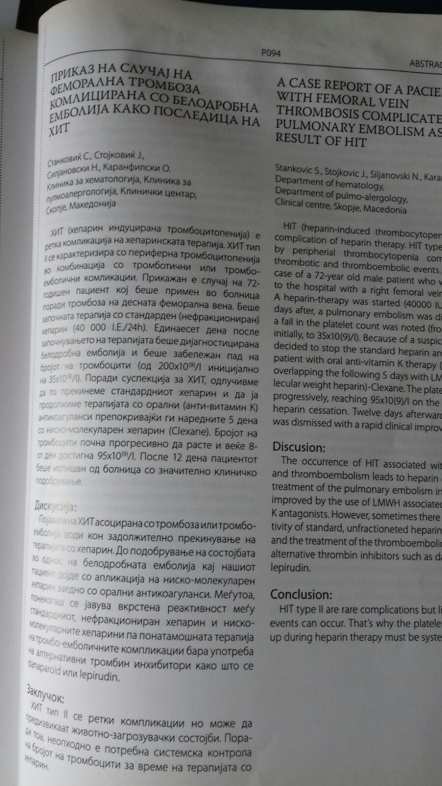 Приказ на случај на феморална тромбоза комплицирана со белодробна емболија како последица на ХИТ