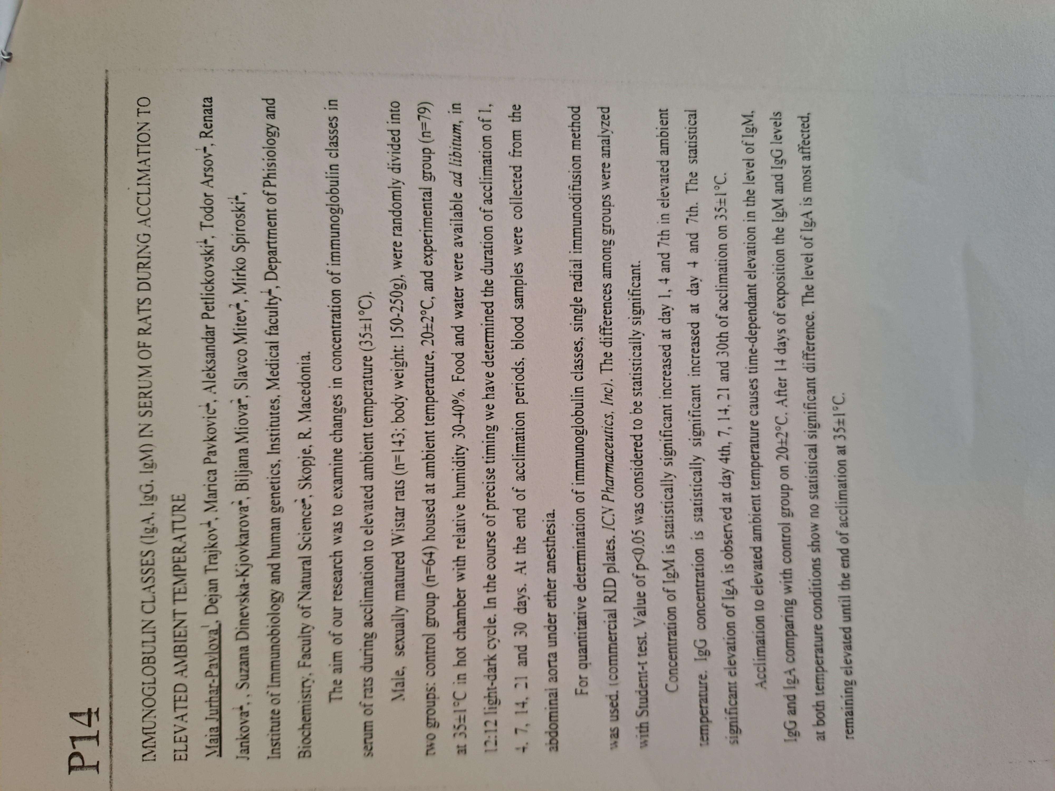 Immunoglobulin classes (IgA, IgG, IgM) in serum of rats during acclimation to elevated ambient temperature.