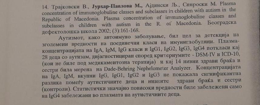 Plasma concentration of immunoglobuline classes and subclasses in children with autism in the Republic of Macedonia