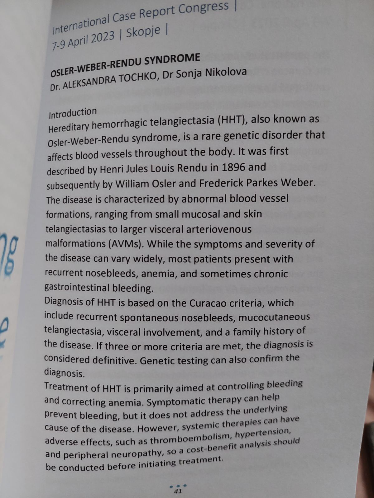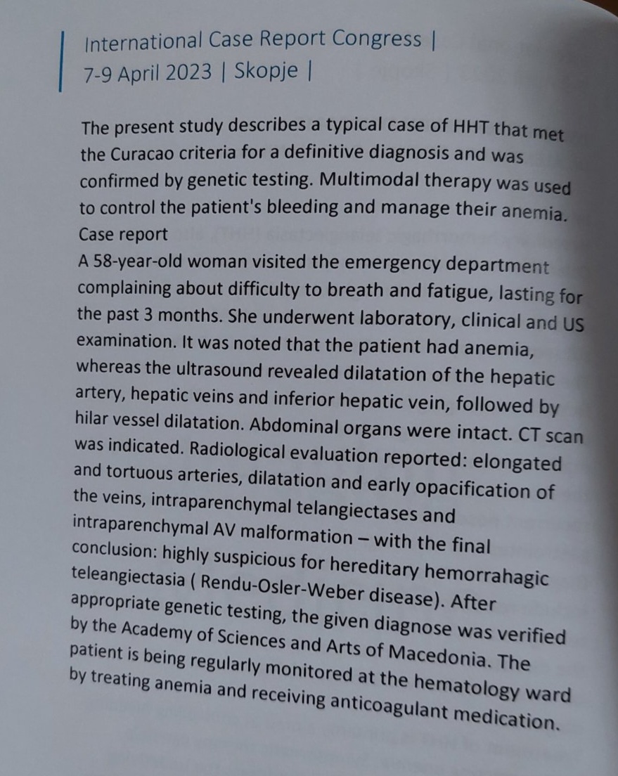 According to the curacao criteria, the present study describes a typical case of HHT, with fulfilled criteria for definite diagnosis, also confirmed by a genetic test.
