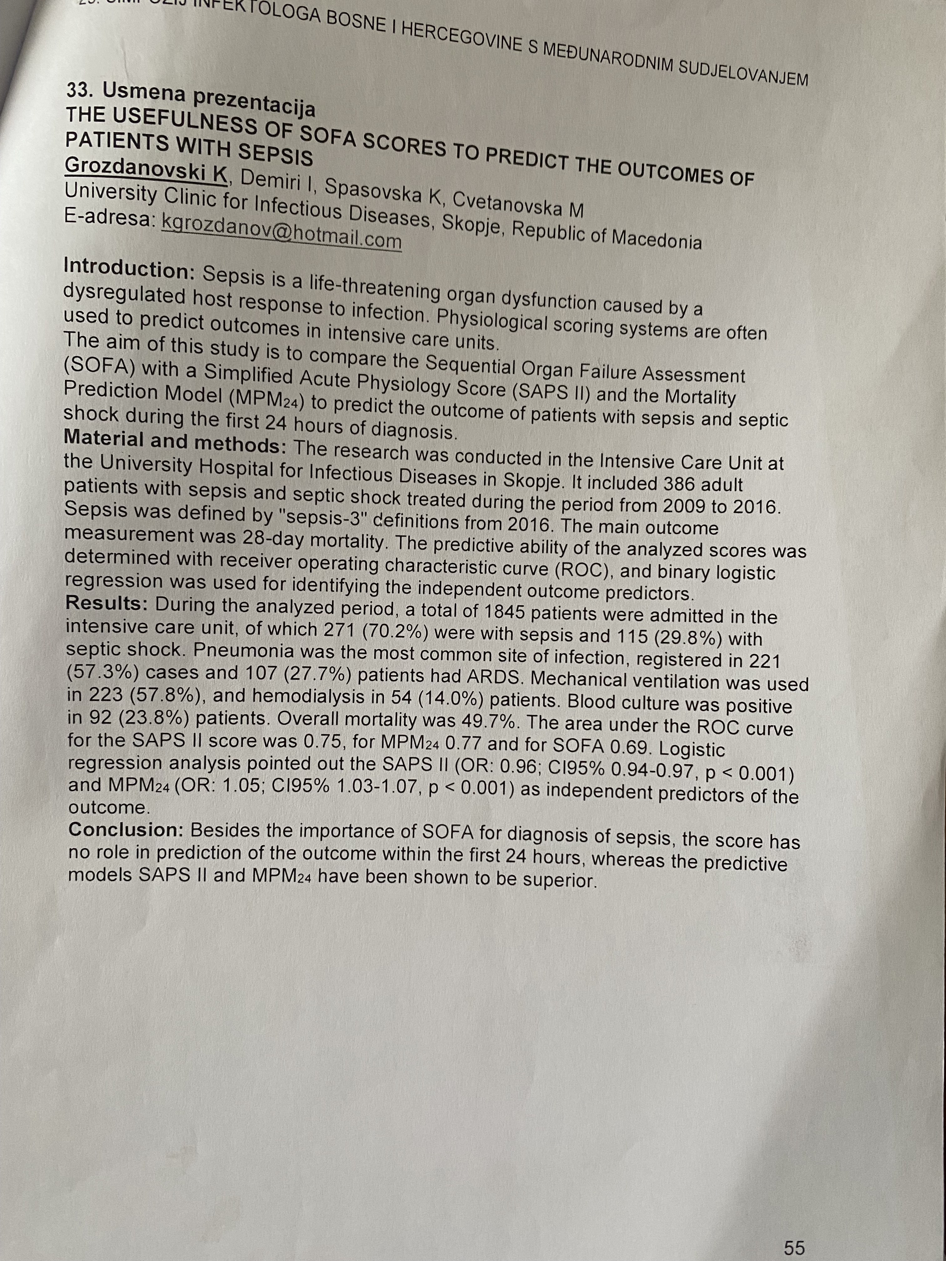 The usefulness of sofa scores to predict the outcomes of patients with sepsis.