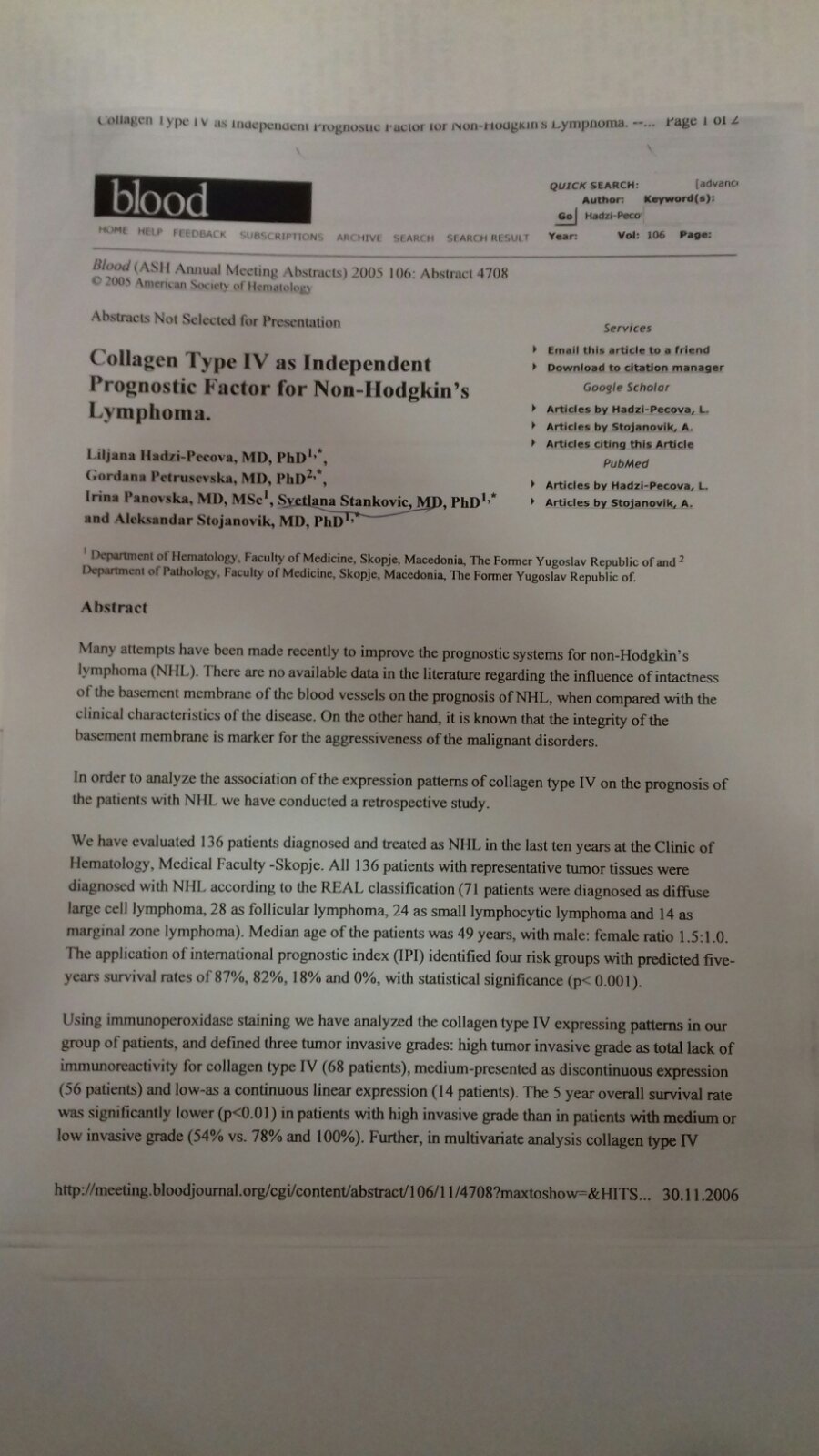 Collagen Type IV as Independent Prognostic Factor for Non Hodgkin lymphoma