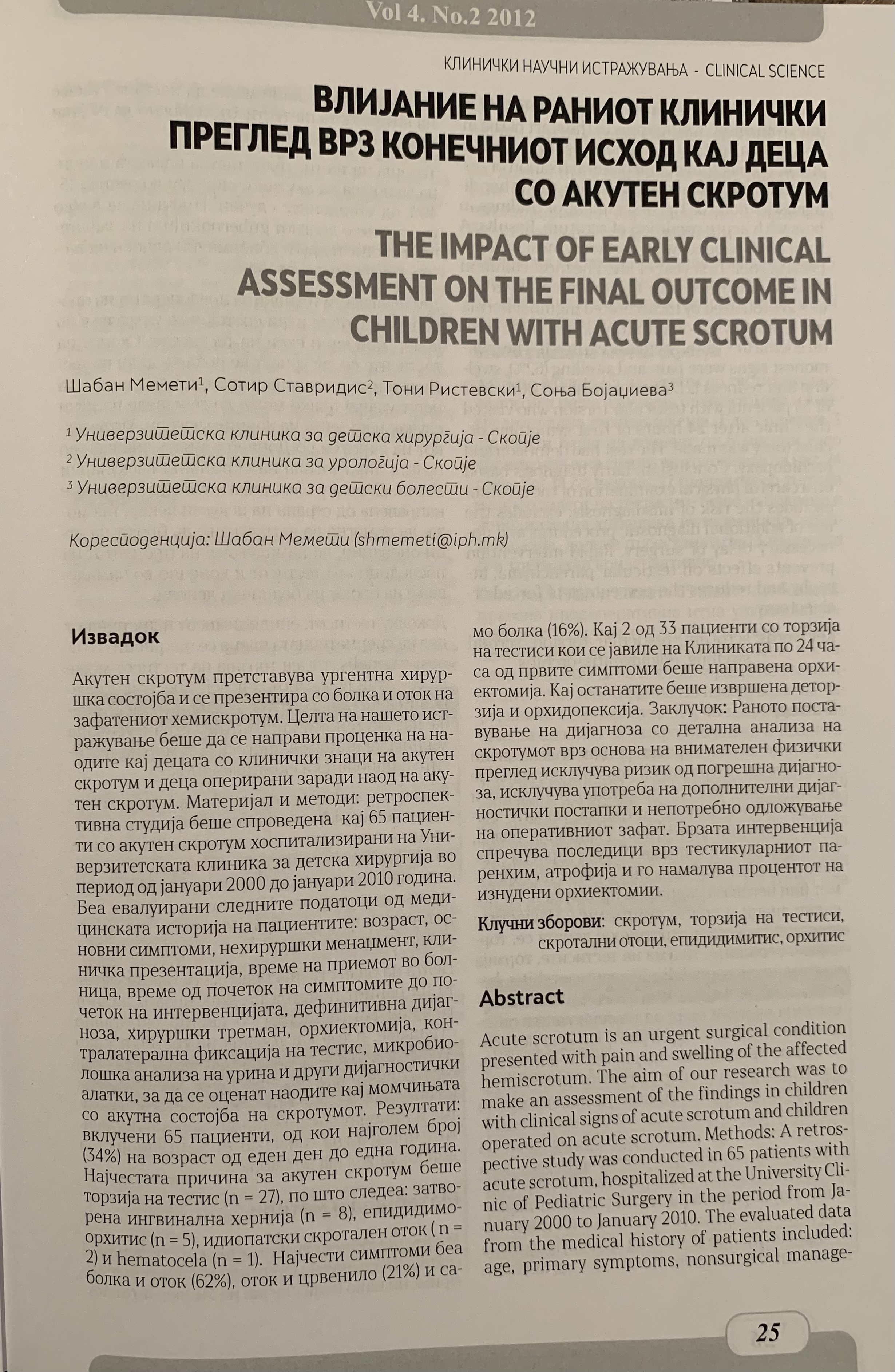 Влијанието на раниот клинички преглед врз конечниот исход кај деца со акутен скротум