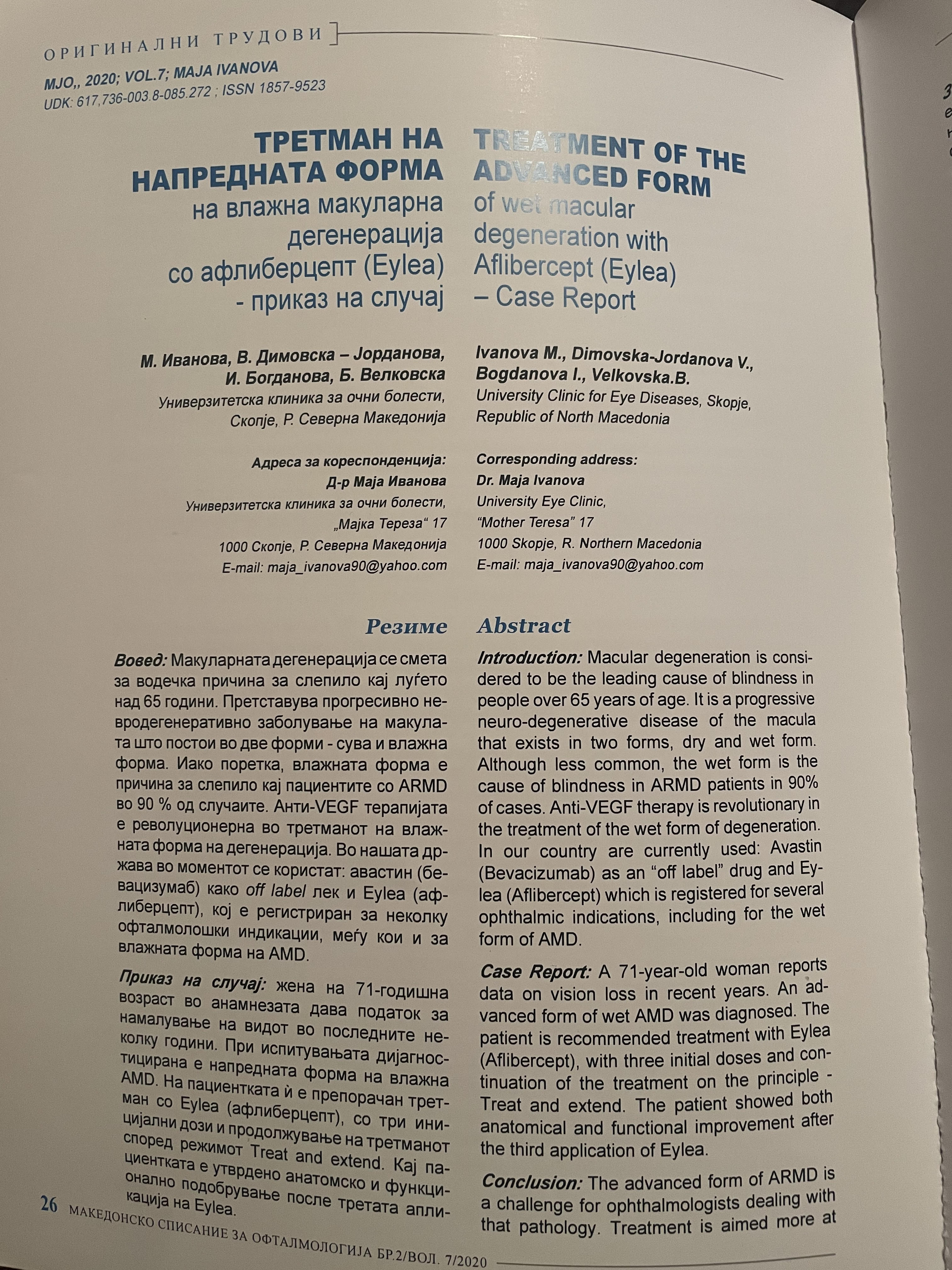 Treatment of the advanced form of wet macular degeneration with Aflibercept (Eylea) - case report