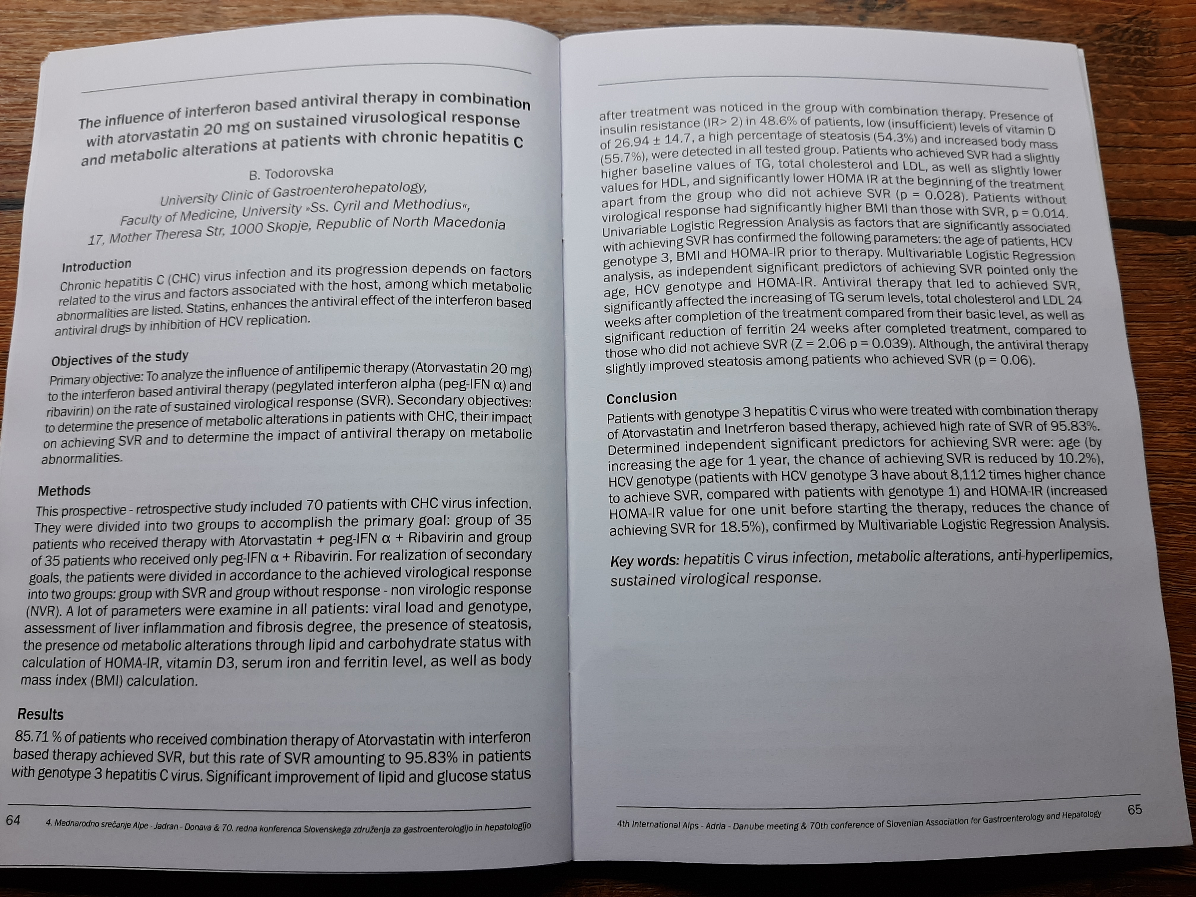 Introduction: Chronic hepatitis C virus infection represents more frequent cause of liver cirrhosis and hepatocellular carcinoma. The severity of the disease and its progression depends on factors related to the virus and factors associated with the host, among which metabolic abnormalities are listed, such as: changes occurring in the metabolism of fats, sugars, vitamin D, iron, the presence of fatty liver, obesity and others. Statins, inhibit HCV replication in vitro, enhances the antiviral effect of the already known antiviral drugs and reduce their resistance. Objectives of the study: Primary objective: To determine the impact of additional therapy (treatment with Atorvastatin 20 mg) to the standard antiviral therapy (pegylated interferon alpha (peg-IFN α) and ribavirin) on achieving sustained virological response (SVR). Secondary objectives: to determine the presence of metabolic alterations in patients with chronic hepatitis C, their impact on achieving SVR, to determine the impact of antiviral therapy on metabolic abnormalities, to determine the influence of genotype on the incidence of metabolic alterations and achieving SVR and to analyze the connection of metabolic alterations with the level of stetatotic, necro-inflammatory and fibrotic changes in the liver, with the gender, age and viral load, aiming to determine their mutual correlation. Material and Methods: In the study which is comparative, open label, prospective - retrospective, 70 patients diagnosed with chronic hepatitis C virus infection who met criteria for treatment with standard antiviral therapy combined with anti-lipemic therapy (Atorvastatin 20 mg) were included. Patients in the study were divided into two groups: one group of 35 patients receiving combination therapy (Atorvastatin + Pegylated alpha interferon + Ribavirin) and another group of 35 patients received only standard antiviral therapy. For the realization of secondary objectives, the patients were divided in accordance to the achieved virological response to group with SVR and group non virologic response (NVR). Those parameters were followed in all patients: genotyping, quantification of the virus, histological assessment of liver inflammation and fibrosis degree (before starting treatment), the presence of steatosis, laboratory analysis: hematology, liver, lipid and carbohydrate status, HbA1c, insulin blood level (the calculation of HOMA-IR), vitamin D3, serum iron, ferritin and body mass index (BMI) calculation. Overall treatment of the patients depends from the virus genotype, thus, patients with genotype 1 and 4 received 48 weeks standard antiviral therapy, but patients with genotypes 2 and 3 received 24 weeks of antiviral therapy. SVR was considered an undetectable levels of HCV RNA levels 24 weeks after completion of antiviral therapy. The results were statistically analyzed, and all results for p <0.05 were considered statistically significant. Results: Combination therapy leads to a slightly higher percentage of SVR (85.71%) in patients with chronic hepatitis C versus standard therapy (74.29%) and in patients with genotype 3 this rate of SVR amounting to 95.83%. Combination therapy leads to significant improvement of lipid and glucose status after treatment, and in terms of side effects, there was no appearance of serious adverse events that would be a reason for discontinuation. Presence of insulin resistance (IR> 2) in 48.6% of patients, low (insufficient) levels of vitamin D of 26.94 ± 14.7, which has not affected significantly the achieved virological response, a high percentage of steatosis (total 54.3% of which 48.6% have mild degree of steatosis and 5.7 have severe steatosis) and increased body mass (55.7% total), of which 40% were overweight and 15.7% obese, were detected in all tested group. Patients who achieved SVR had a slightly higher baseline values of TG, total cholesterol and LDL, as well as slightly lower values for HDL, and significantly lower HOMA IR at the beginning of the treatment apart from the group who did not achieve SVR (p = 0.028). Patients without virological response had significantly higher BMI than those with SVR, p = 0.014. Univariable Logistic Regression Analysis as factors that are significantly associated with achieving SVR has confirmed the following parameters: the age of patients, HCV genotype 3, BMI and HOMA-IR prior to therapy. Multivariable Logistic Regression analysis, as independent significant predictors of achieving SVR pointed only the age, HCV genotype and HOMA-IR. Antiviral therapy that led to achieved SVR, significantly affected the increasing of TG serum levels, total cholesterol and LDL 24 weeks after completion of the treatment compared from their basic level, as well as significant reduction of ferritin 24 weeks after completed treatment, compared to those who did not achieve SVR (Z = 2.06 p = 0.039). Although, the antiviral therapy slightly improved steatosis among patients who achieved SVR (p = 0.06). Early virological response, response at the end of treatment and SVR, significantly more frequently encountered in patients with genotype 3. Genotype 1 patients had significantly higher BMI, higher glucose and insignificantly higher HOMA-IR, compared to patients with genotype 3. Values of cholesterol and its fractions, LDL and HDL were lower in the group with genotype 3, with significant difference for HDL. The presence of steatosis was associated with BMI, with insulin blood level and HOMA-IR. There was a negative correlation between inflammatory changes in the liver and HDL, while Knodell score positively correlated with glucose, insulin blood level, HOMA-IR index, ferritin and serum iron. The presence of fibrotic changes and cirrhosis of the liver were correlated with higher values of LDL, glucose and ferritin. From the metabolic parameters only glucose, serum iron and ferritin values prior treatment were significantly dependent on the gender of the subjects, with significantly higher
