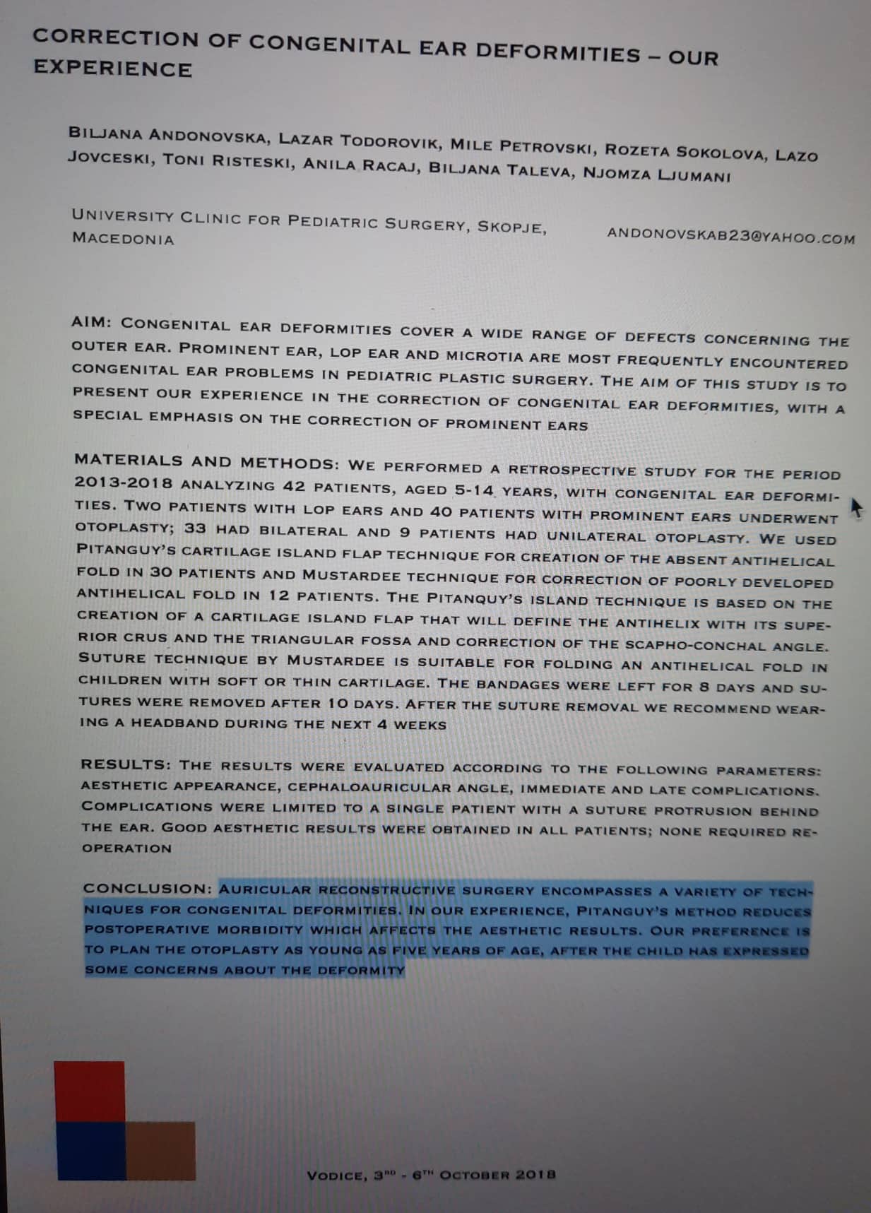 Congenital ear deformities cover a wide range of defects concerning the outer ear. Prominent ear, lop ear and microtia are most frequently encountered congenital ear problems in pediatric plastic surgery. The aim of this study is to present our experience in the correction of congenital ear deformities, with a special emphasis on the correction of prominent ears.