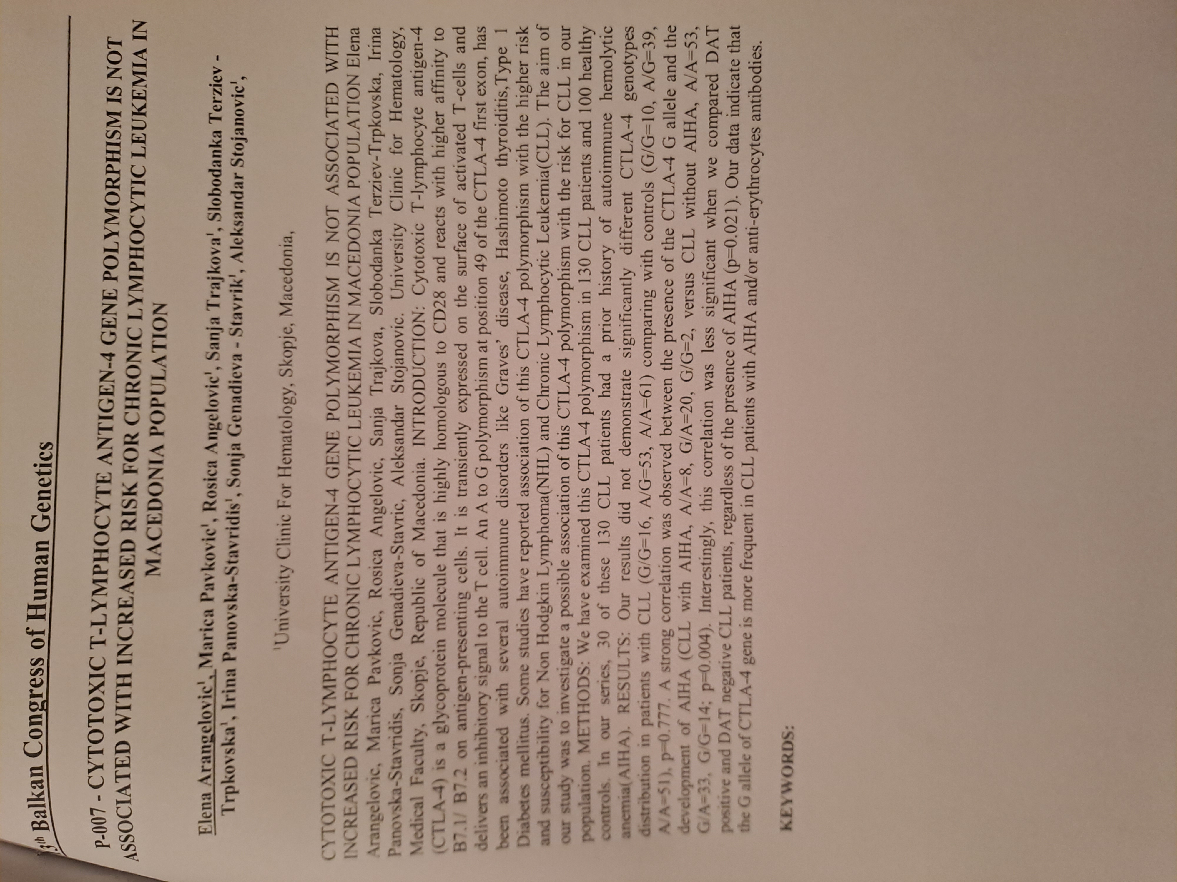 Cytotoxic T-Lymphocyte antigen-4 gene polymorphism is not associated with increased risk for chronic lymphocytic leukemia in Macedonian population.