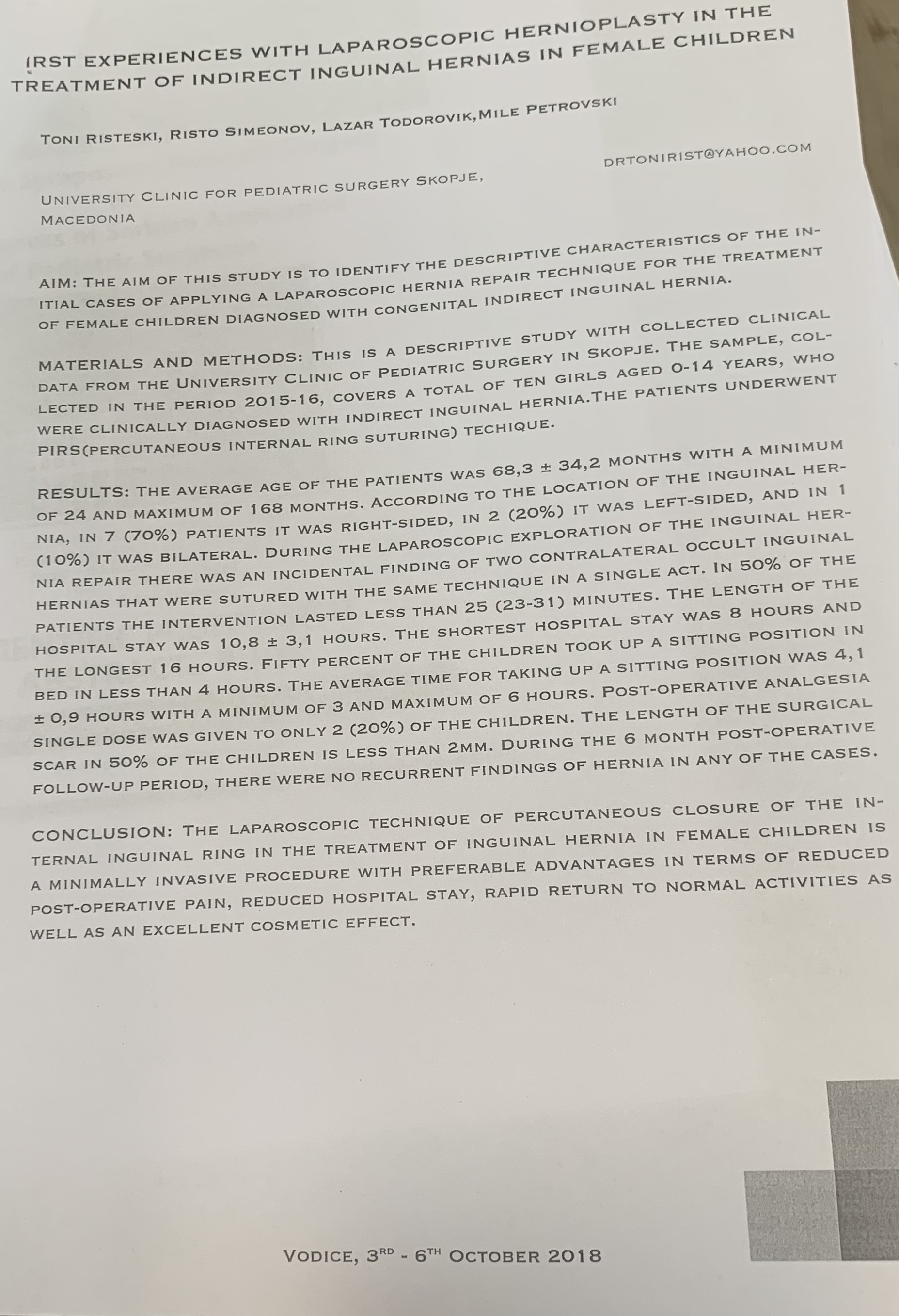 Materials and method: This is a descriptive study with collected clinical data from the University Clinic of Pediatric Surgery in Skopje. The sample, collected in the period 2015-16, covers a total of ten girls aged 0-14 years, who were clinically diagnosed with indirect inguinal hernia.The patients underwent PIRS(percutaneous internal ring suturing) techique.Results: The average age of the patients was 68,3 ± 34,2 months with a minimum of 24 and maximum of 168 months. According to the location of the inguinal hernia, in 7 (70%) patients it was right-sided, in 2 (20%) it was left-sided, and in 1 (10%) it was bilateral. During the laparoscopic exploration of the inguinal hernia repair there was an incidental finding of two contralateral occult inguinal hernias that were sutured with the same technique in a single act. In 50% of the patients the intervention lasted less than 25 (23-31) minutes. The length of the hospital stay was 10,8 ± 3,1 hours. The shortest hospital stay was 8 hours and the longest 16 hours. Fifty percent of the children took up a sitting position in bed in less than 4 hours. The average time for taking up a sitting position was 4,1 ± 0,9 hours with a minimum of 3 and maximum of 6 hours. Post-operative analgesia single dose was given to only 2 (20%) of the children. The length of the surgical scar in 50% of the children is less than 2mm. During the 6 month post-operative follow-up period, there were no recurrent findings of hernia in any of the cases. Conclusion:The laparoscopic technique of percutaneous closure of the internal inguinal ring in the treatment of inguinal hernia in female children is a minimally invasive procedure with preferable advantages in terms of reduced post-operative pain, reduced hospital stay, rapid return to normal activities as well as an excellent cosmetic effect.