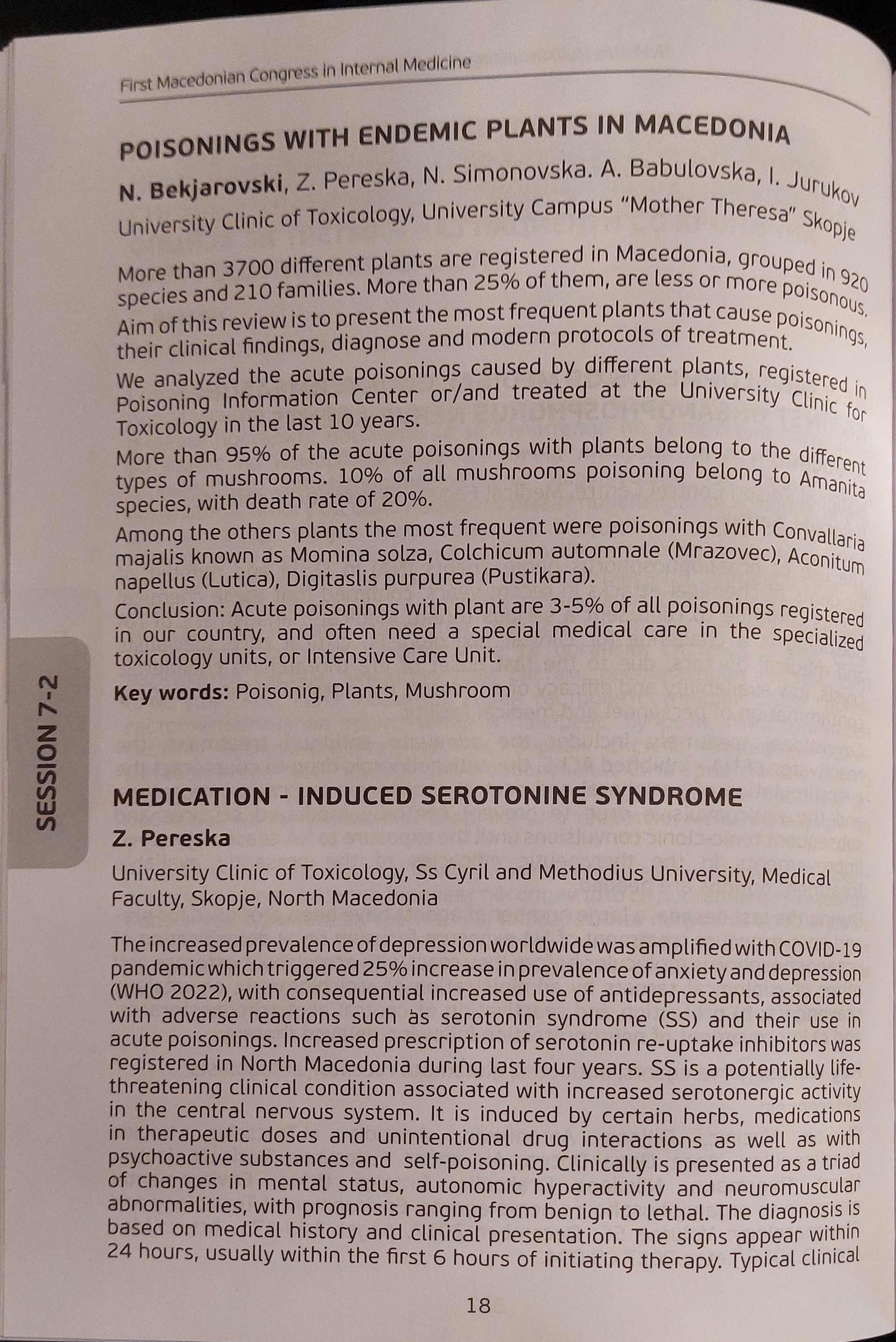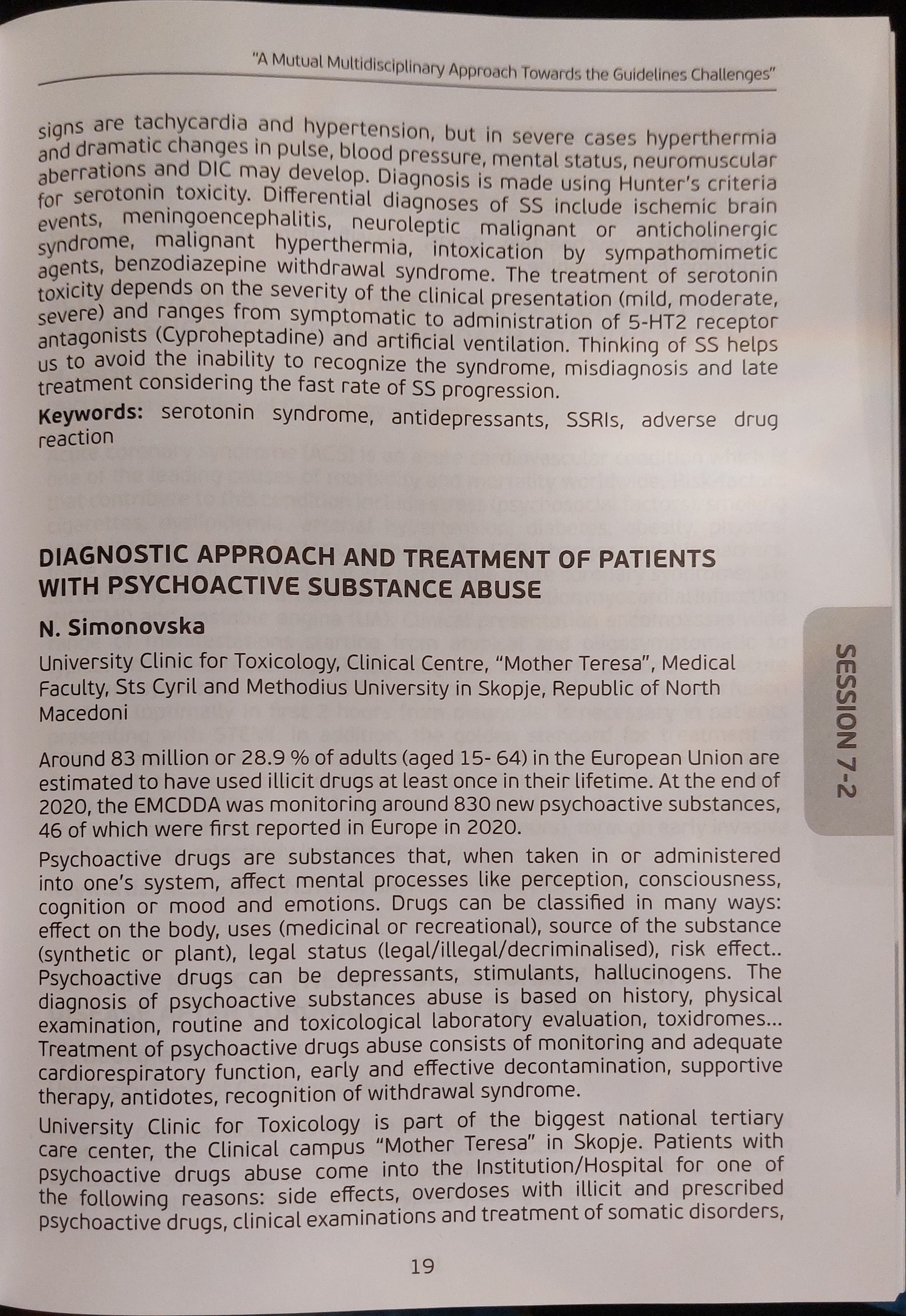 The increased prevalence of depression worldwide was amplified with COVID-19 pandemic which triggered 25% increase in prevalence of anxiety and depression (WHO 2022), with consequential increased use of antidepressants, associated with adverse reactions such as serotonin syndrome (SS) and their use in acute poisonings. Increased prescription of serotonin re-uptake inhibitors was registered in North Macedonia during last four years. SS is a potentially life-threatening clinical condition associated with increased serotonergic activity in the central nervous system. It is induced by certain herbs, medications in therapeutic doses and unintentional drug interactions as well as with psychoactive substances and self-poisoning. Clinically is presented as a triad of changes in mental status, autonomic hyperactivity and neuromuscular abnormalities, with prognosis ranging from benign to lethal. The diagnosis is based on medical history and clinical presentation. The signs appear within 24 hours, usually within the first 6 hours of initiating therapy. Typical clinical signs are tachycardia and hypertension, but in severe cases hyperthermia and dramatic changes in pulse, blood pressure, mental status, neuromuscular aberrations and DIC may develop. Diagnosis is made using Hunter's criteria for serotonin toxicity. Differential diagnoses of SS include ischemic brain events, meningoencephalitis, neuroleptic malignant or anticholinergic syndrome, malignant hyperthermia, intoxication by sympathomimetic agents, benzodiazepine withdrawal syndrome. The treatment of serotonin toxicity depends on the severity of the clinical presentation (mild, moderate, severe) and ranges from symptomatic to administration of 5-HT2 receptor antagonists (Cyproheptadine) and artificial ventilation. Thinking of SS helps us to avoid the inability to recognize the syndrome, misdiagnosis and late treatment considering the fast rate of SS progression.