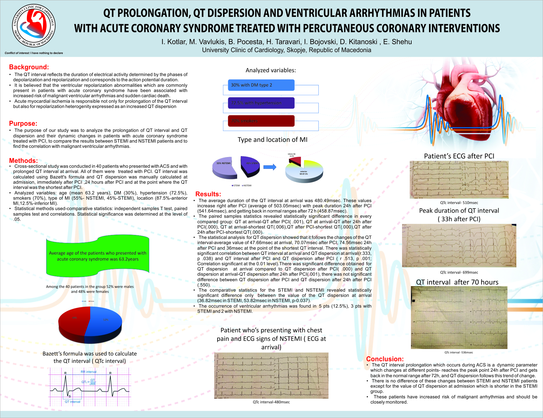 The QT interval prolongation which happens during acute coronary syndrome is a dynamic parameter which changes at different points-reaches the peak point 24h after PCI and gets back in the normal range after 72h. QT dispersion follows this trend of change as well. Theres no difference of these changes between patients who present with STEMI, and patients with NSTEMI, except for the value of QT dispersion at admission which is shorter in the STEMI group. These patients have increased risk of malignant arrhythmias and should be closely monitored