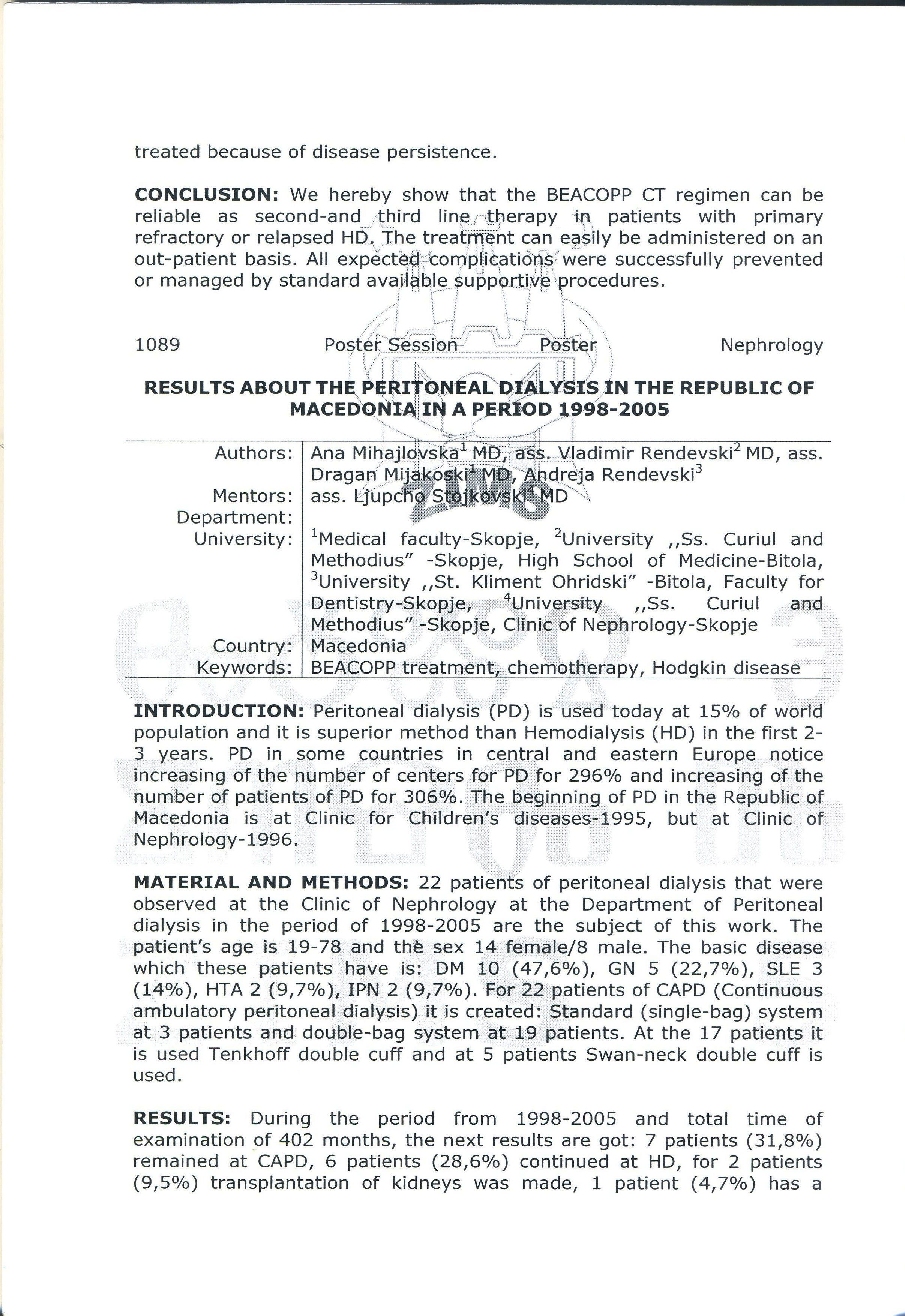 Results about the peritoneal dialysis in the Republic of Macedonia in a period 1998-2005.