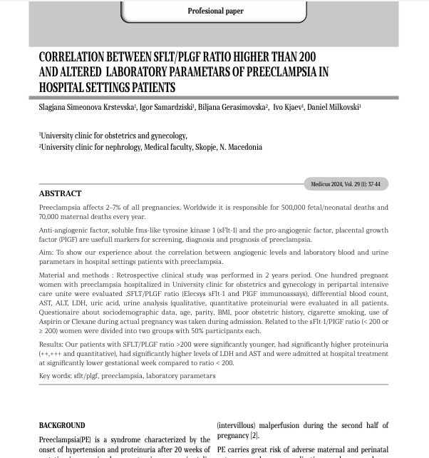 CORRELATION BETWEEN SFLT/PLGF RATIO HIGHER THAN 200 AND ALTERED LABORATORY PARAMETARS OF PREECLAMPSIA IN HOSPITAL SETTINGS PATIENTS