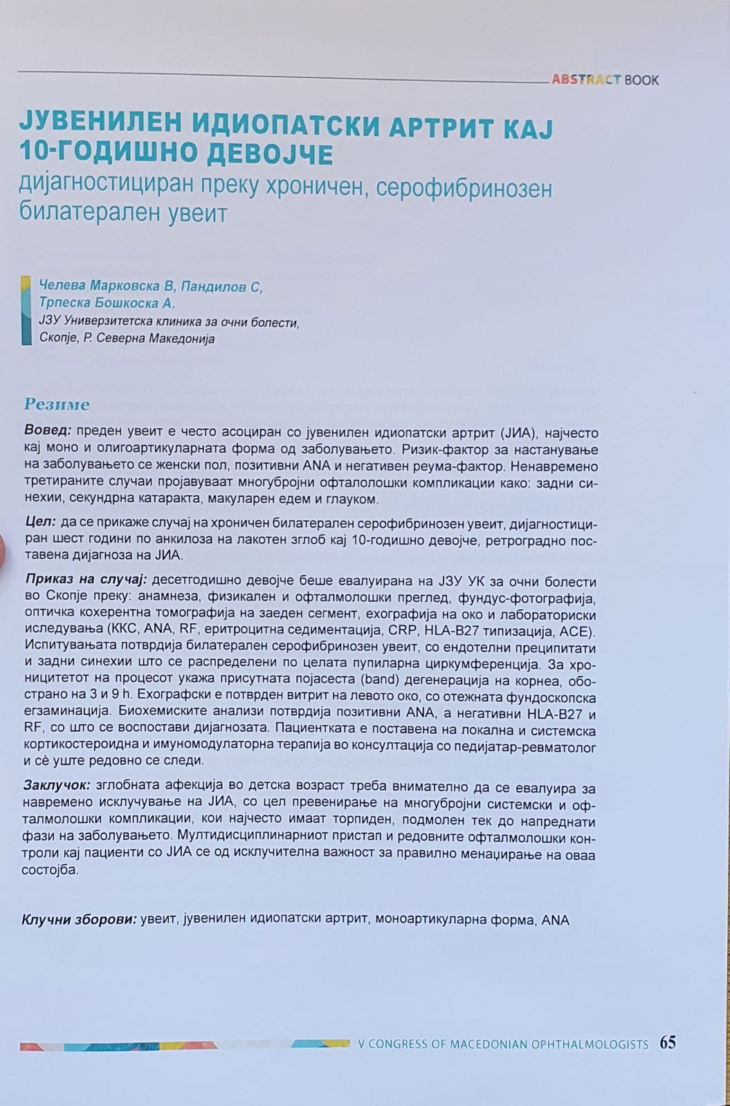 ЈУВЕНИЛЕН ИДИОПАТСКИ АРТРИТ КАЈ 10-ГОДИШНО ДЕВОЈЧЕ дијагностициран преку хроничен, серофибринозен билатерален увеит