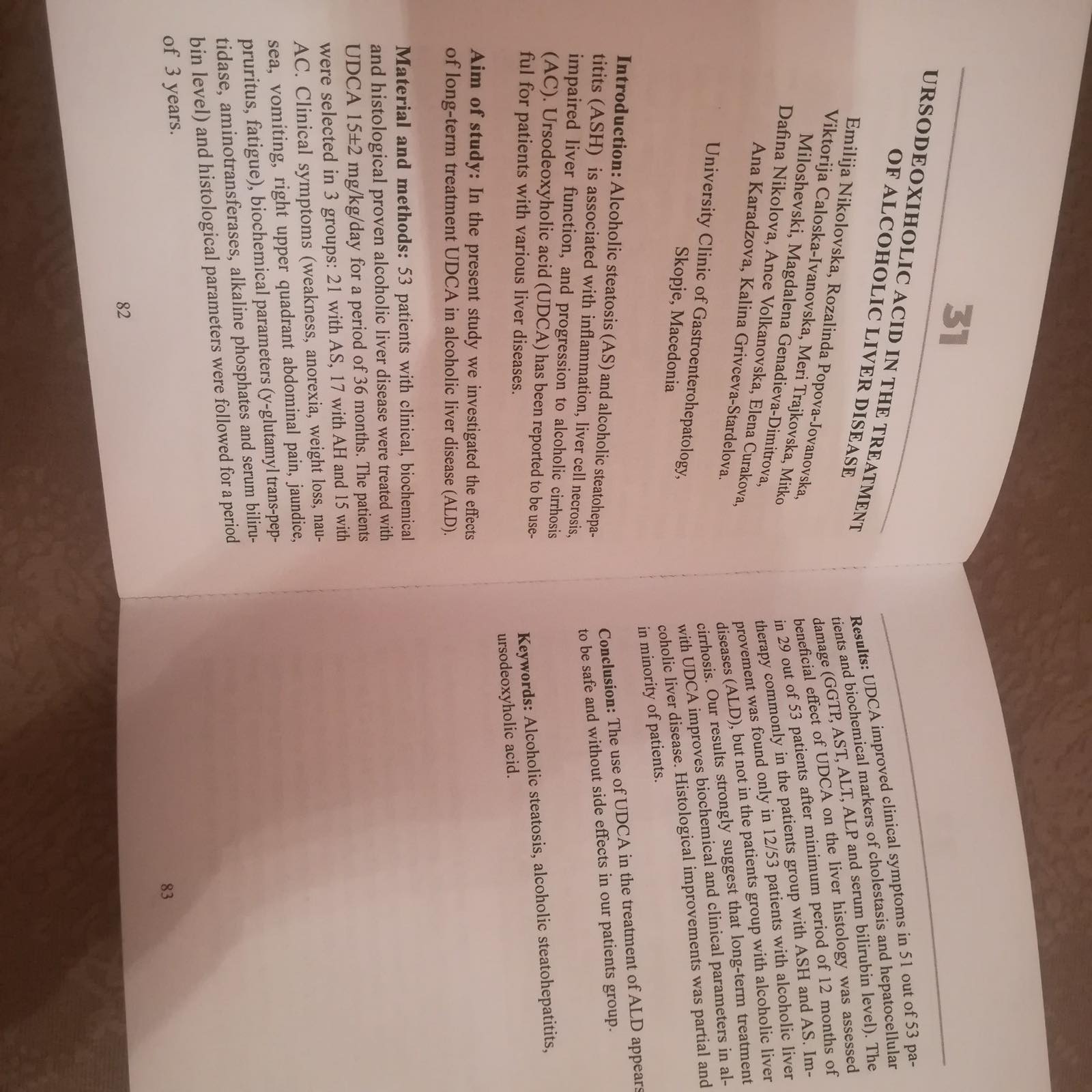 Results: UDCA improved clinical symptoms in 51 out of 53 patients and biochemical markers of cholestasis and hepatocellular damage (GGTP, AST, ALT, ALP and serum bilirubin level). The beneficial effect of UDCA on the liver histology was assessed in 29 out of 53 patients after minimum period of 12 months of therapy commonly in the patients group with ASH and AS. Improvement was found only in 12/53 patients with alcoholic liver diseases (ALD), but not in the patients group with alcoholic liver cirrhosis. Our results strongly suggest that long-term treatment with UDCA improves biochemical and clinical parameters in alcoholic liver disease. Histological improvements was partial and in minority of patients.