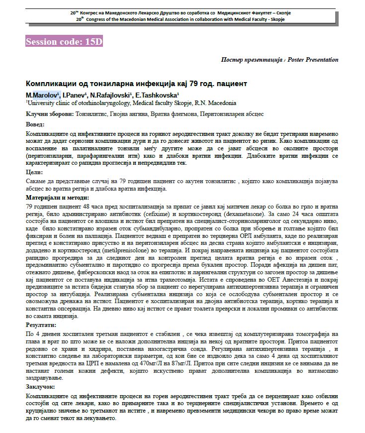 Сакаме да представиме случај на 79 годишен пациент со акутен тонзилитис , којшто како компликација појавува