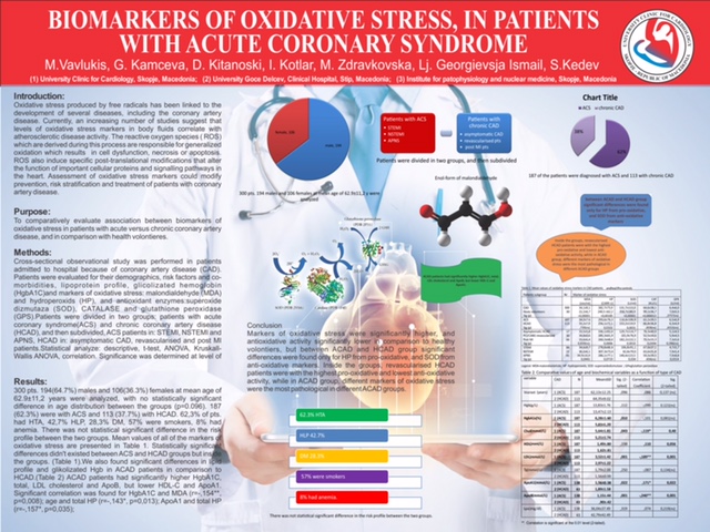Methods :Cross-sectional observational study was performed in patients admitted because of coronary artery disease (CAD). Pts were evaluated for their demographics, risk factors and co-morbidities, lipoprotein profile, HgbA1C and markers of oxidative stress: malondialdehyde (MDA) and hydroperoxids (HP), and antioxidant enzymes: superoxide dizmutaza (SOD), CATALASE and glutathione peroxidase (GPS). Pts were divided in 2 groups: pts with acute coronary syndrome (ACS) and chronic coronary artery disease (HCAD), and then subdivided, ACS pts in: STEMI, NSTEMI and APNS, HCAD in: asymptomatic CAD, revascularized and post MI patients. Statistical analysis: descriptive, t-test, ANOVA, Kruskall-Wallis ANOVA, correlation. Significance was determined at level of 0.05.Results :300 pts. 194 males and 106 females at mean age of 62.9±11,2 y were analyzed. 187 were with ACS and 113 with HCAD. 62,3% of pts. had HTA, 42,7% HLP, 28,3% DM, 57% smokers, 8% had anemia. There was no significant difference in the risk profile between the two groups. Mean values of the markers of OS (Table 1). Statistically significant differences didn’t existed between ACS and HCAD groups but inside the groups(Table 1), in lipid profile and HgbA1C in ACAD pts compared to HCAD.ACAD pts had higher HgbA1C, total, LDL and ApoB, but lower HDL-C and ApoA1. Correlation was found for HgbA1C and MDA (r=-,154**, p=0,008); age and total HP (r=-,143*, p=0,013); ApoA1 and total HP (r=-,157*, p=0,035);Conclusion: Markers of oxidative stress were significantly higher, and antioxidative activity was lower compared to healthy volunteers, but between ACAD and HCAD group significant differences were found only for HP from pro-oxidative, and SOD from anti-oxidative markers. Inside the groups, revascularized HCAD pts were with the highest pro-oxidative and lowest anti-oxidative activity, while in ACAD group, different markers of OS were the most pathological in different ACAD groups