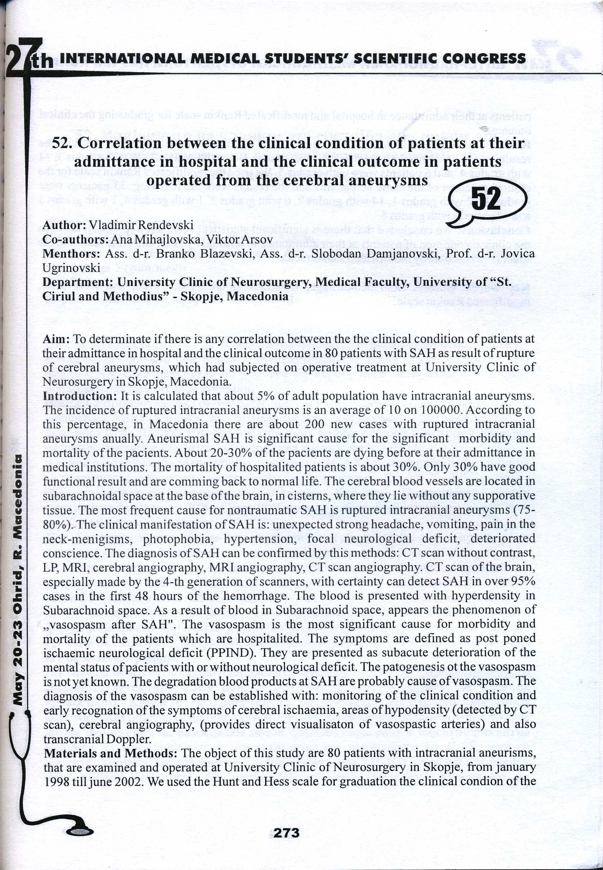 Correlation between the clinical condition of patient at their admittance in hospital and the clinical outcome in patients operated from the cerebral aneurysms.