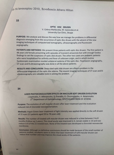 Patients and metohods: We present three patients with optic disc drusen. The first patient is 48 years old female presenting with episodes of transient amaurosis but with enough fundus findings to set the suspicions of optic disk drusen. The other two cases are pediatric patients who were hospitalized for arthritis and fever of unknown origin, and in which routine fundoscopic examination reveled unilateral oedema of the optic disc. Fluorescein angiography, CT scan and B ultrasonography was done in all the the above patients. Results and conclusion: Deep sited optic disk drusen are often a problem in the differential diagnosis of the optic disc edema. THe newest imaging techniques of CT-scan and B-ultrasonography are valuable tools in solving the problem.