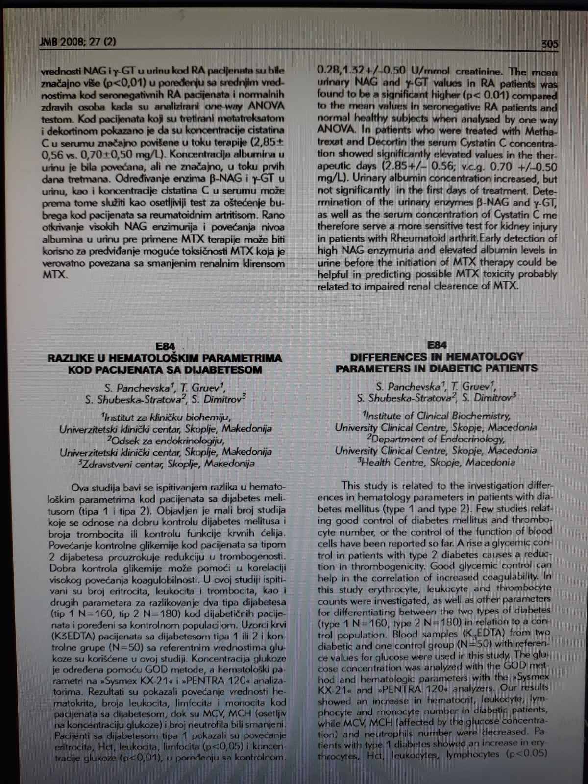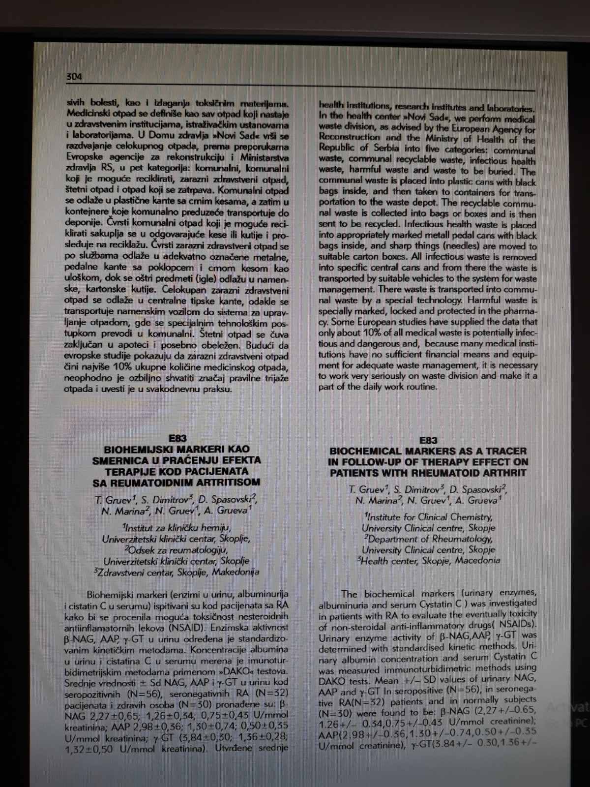 The biochemical markers (urinary enzymes, albuminuria and serum Cystatin C ) was investigated in patients with RA to evaluate the eventually toxicity of non-steroidal anti-inflammatory drugs( NSAIDs). Urinary enzyme activity of b-NAG,AAP, g-GT was determined with standardised kinetic methods. Urinary albumin concentration and serum Cystatin C was measured immunoturbidimetric methods using DAKO tests. Mean +/– SD values of urinary NAG, AAP and g-GT In seropositive (N=56), in seronegative RA(N=32) patients and in normally subjects (N=30) were found to be: b-NAG (2,27+/–0.65, 1.26+/– 0.34,0.75+/–0.43 U/mmol creatinine); AAP(2.98+/–0.36,1.30+/–0.74,0.50+/–0.35 U/mmol creatinine), g-GT(3.84+/– 0.30,1.36+/–0.28,1.32+/–0.50 U/mmol creatinine. The mean urinary NAG and g-GT values in RA patients was found to be a significant higher (p< 0.01) compared to the mean values in seronegative RA patients and normal healthy subjects when analysed by one way ANOVA. In patients who were treated with Methatrexat and Decortin the serum Cystatin C concentration showed significantly elevated values in the therapeutic days (2.85+/– 0.56; v.c.g. 0.70 +/–0.50 mg/L). Urinary albumin concentration increased, but not significantly in the first days of treatment. Determination of the urinary enzymes b-NAG and g-GT, as well as the serum concentration of Cystatin C me therefore serve a more sensitive test for kidney injury in patients with Rheumatoid arthrit.Early detection of high NAG enzymuria and elevated albumin levels in urine before the initiation of MTX therapy could be helpful in predicting possible MTX toxicity probably related to impaired renal clearence of MTX.