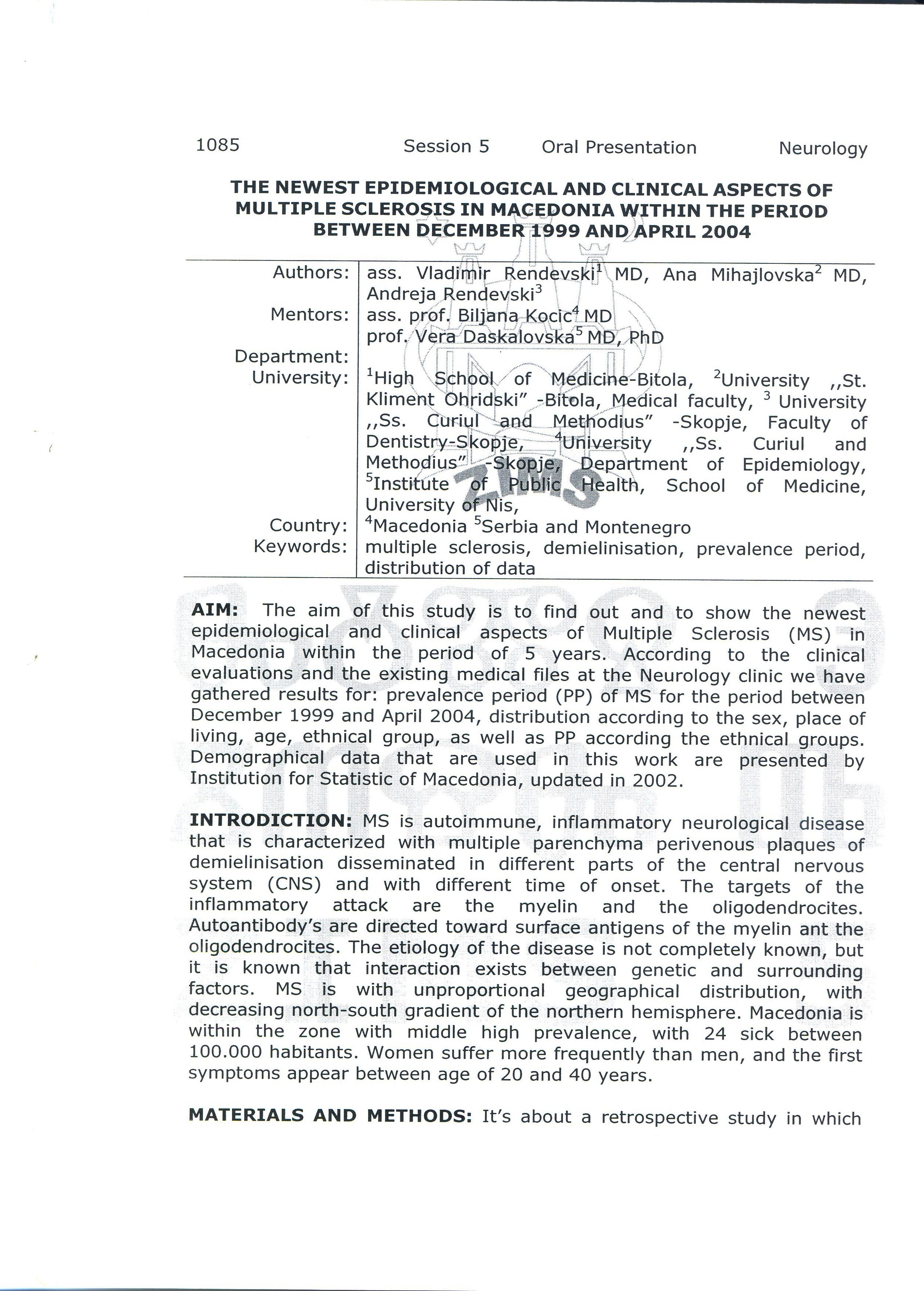 The newest epidemiological and clinical aspects of multiple sclerosis in Macedonia whitin the period between December 1999-april 2004.