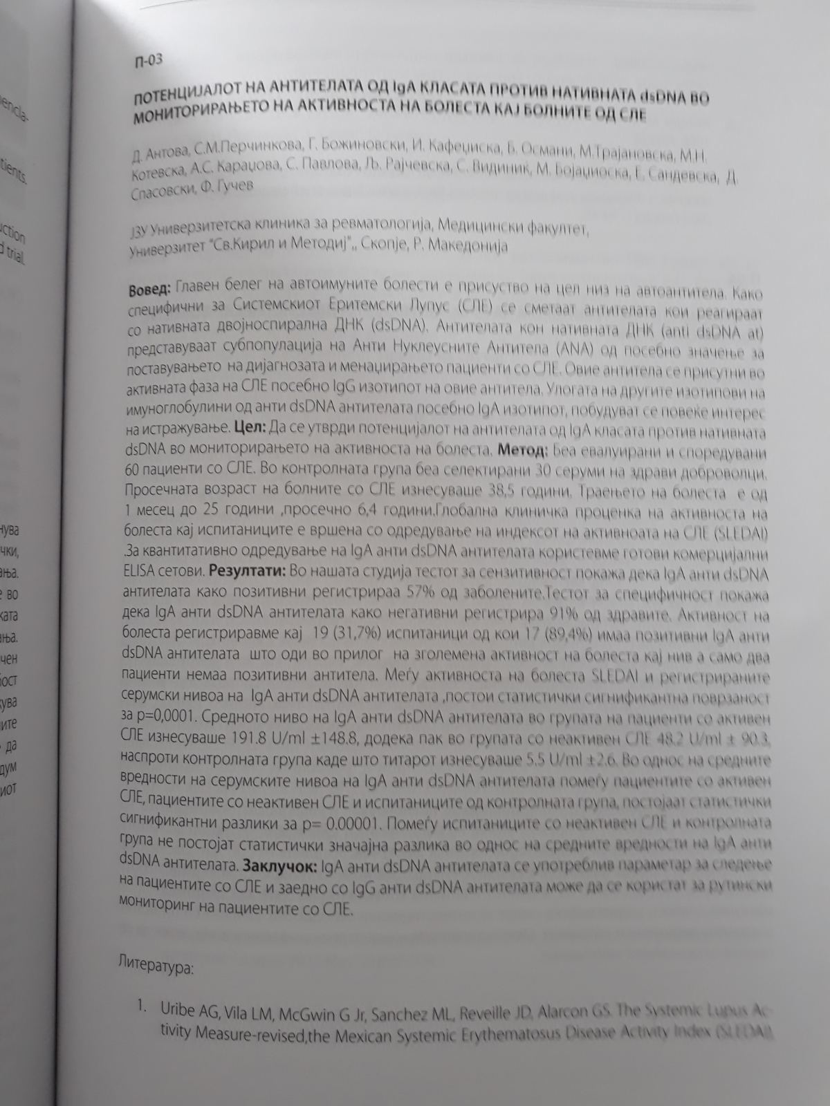 Потенцијалот на антителата од IgA класата против нативната dsDNA во мониторирањето на активноста на болеста кај болните од СЛЕ