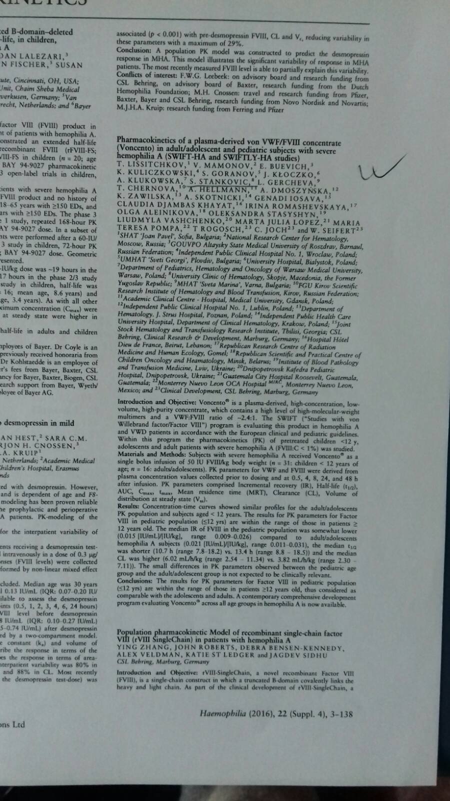 Pharmacokinetics of plasma-derived von VWF/FVIII concentrate (Voncento) in adult/adolescent and pediatric subjets with severe hemophilia A (SWIFT-HA and SWIFTLY-HA studies)