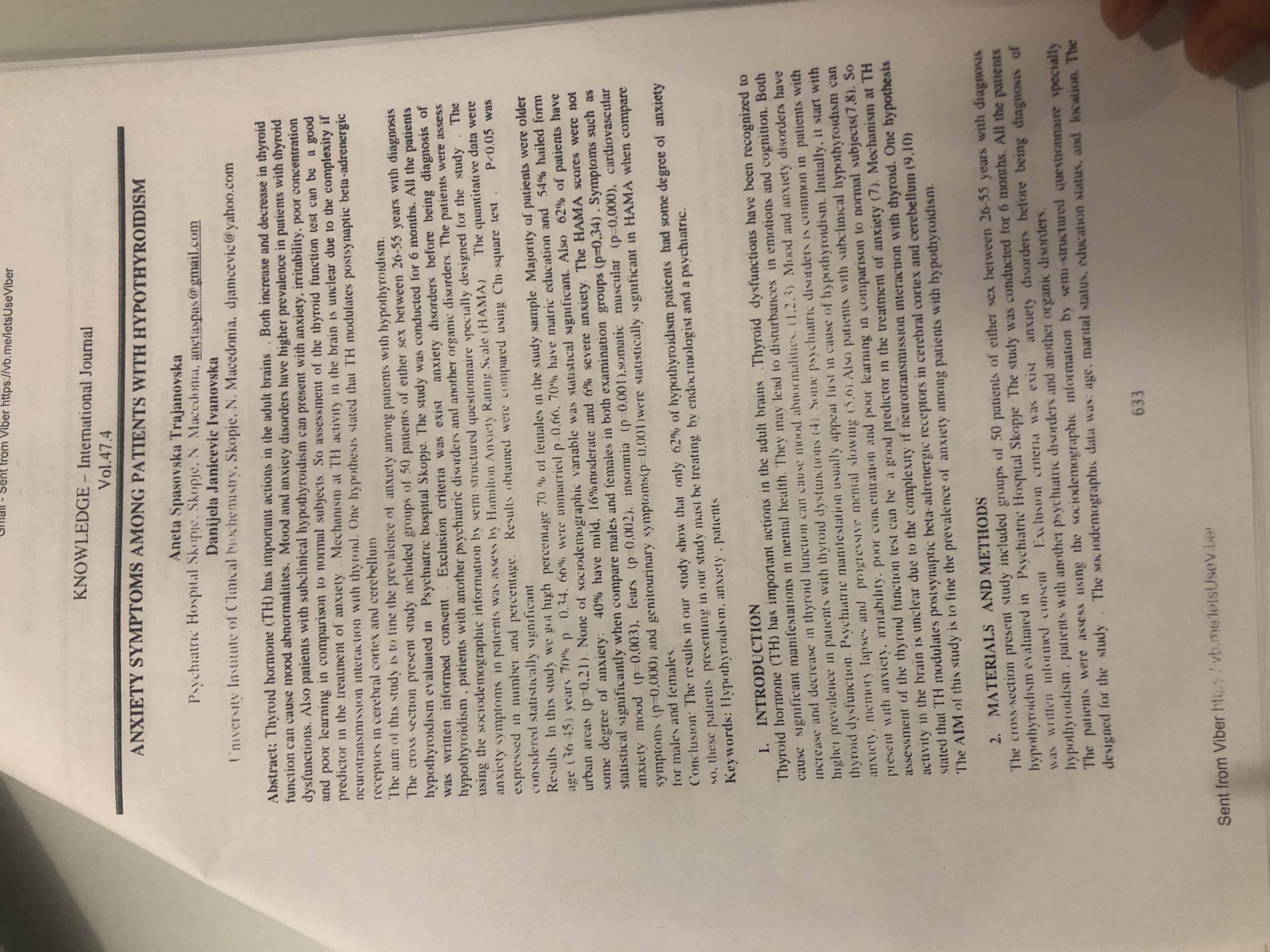 http://hdl.handle.net/20.500.12188/34329| Title: | ANXIETY SYMPTOMS AMONG PATIENTS WITH HYPOTHYROIDISM | Authors: | Spasovska Trajanovska, Aneta Janichevikj Ivanovska, Danijela |